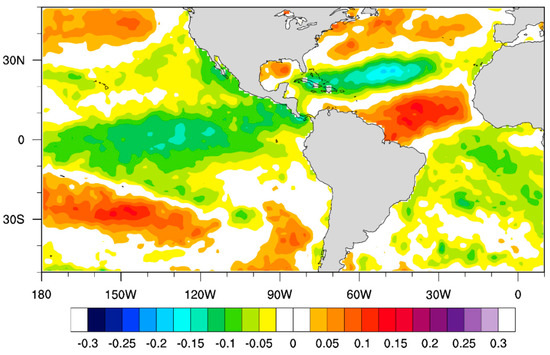 Correlation analyses of the concurrent JJA SSTAs with early season (JJA) PPTA (Figure 6c) show four features. Firstly, a positive zonal correlation from the Caribbean Sea to the Tropical Atlantic along the 10° N line is apparent. The positive zonal correlation along the 10° N line in the Atlantic coincides with the Intertropical Convergence Zone (ITCZ) band, which lies between 10° S and 10° N [43]. Variations in the meridional direction of this ITCZ centerline have been known to cause variation in deep convection processes [44] and thus act as an enhancer for Trinidad’s rainfall. However, the influence of this zonal SSTA is weaker in comparison to the previous MAM season’s SSTA (Figure 6b). Secondly, in the Pacific there is a negative zonal correlation along the 10° N line, and thirdly, the Gulf of Mexico correlation in the ERS (JJA) disappears; however, the previous DJF and MAM SSTAs have a negative influence. The fourth feature is that the ERS rainfall and South Atlantic SSTs between 30° S–50° S, 40° W–0° in DJF are negatively correlated with correlations between −0.3 and −0.4 (Figure 6). The negative influence decreases in magnitude as the season progresses into MAM and then JJA (which is concurrent with the ERS). Maximum correlations at concurrent time were −0.1. Negative correlations initially in the Gulf of Mexico during DJF and MAM decrease in magnitude until they are non-existent by the ERS.