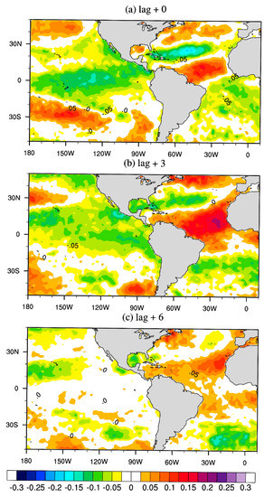 At concurrent time, the Gulf of Mexico is positively correlated with rainfall. Just adjacent to this region of positive correlations is a region of negative correlations with SSTAs in the Caribbean Sea. Therefore, the positive correlations in the Gulf of Mexico appear to be a localized effect. A region of positive correlations develops below the region of negative correlations and forms part of the Atlantic dipole between the northeastern coast of South America and the northwestern coast of Africa.
