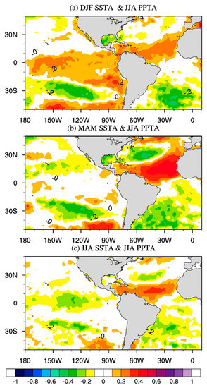 Correlations between Trinidad’s early rainy season (ERS) (JJA) precipitation anomaly PPTA and seasonal SSTAs. Correlation maps show (a) December–January–February (DJF) SSTAs and JJA PPTA, (b) March–April–May (MAM) SSTAs and JJA PPTA, and (c) JJA SSTAs and JJA PPTA.