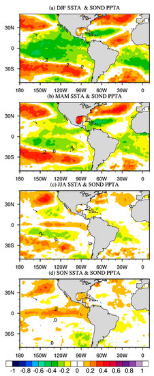 Correlation between Trinidad’s late rainfall season (SOND) PPTA and seasonal SSTAs. Correlation maps for (a) DJF SSTAs and SOND PPTA, (b) MAM SSTAs and SOND PPTA, (c) JJA SSTAs and SOND PPTA and (d) SON SSTAs and SOND PPTA.