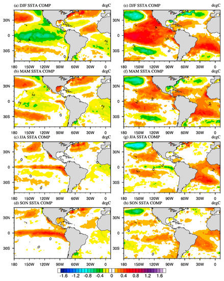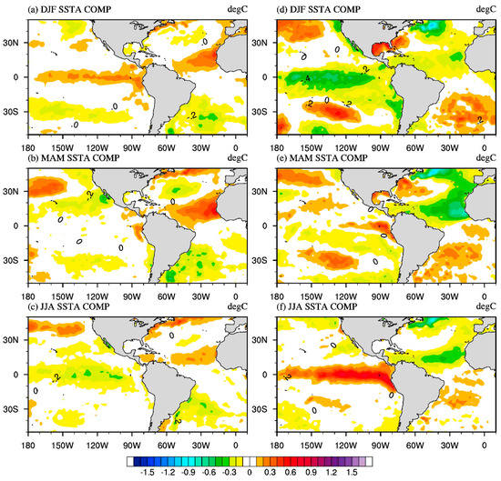 Another feature observed on the composite maps was the transitions in the Atlantic warm pool. These influences shown here (Figure 8d–f) from the DJF to the JJA seasons are similar to those obtained by Taylor et al. [12], Wang et al. [46], and Gimeno et al. [51].