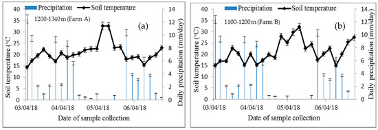 Large weekly variation in daily precipitation was observed from March to June in 2018, with a dry spell in the last days of May. As expected, higher precipitation was observed at the higher elevations (>1200 m), and precipitation decreased at lower elevations (900–1800 m) (Figure 2). On average, precipitation was 3.5 mm/day at 1200–1340 m (farm A), 2.6 mm/day at 1100–1200 m (farm B), and 3.0 mm/day at 900–1000 m (farm C) (Figure 2). The total precipitation for the entire sampling period (March, April, May, and June) was 561, 477, and 395 mm, at 1200–1340 m (farm A), 1100–1200 m (farm B), and 900–1000 m (farm C), respectively. The amount of precipitation was higher in March and June and lowest in May at all the elevation ranges. On average, the soil temperatures in the upper 12 cm were higher at 900–1000 m (farm C), followed by 1100–1200 m (farm B), and lowest at 1200–1340 m (farm A), with the mean values of 23.2, 21.1, and 20.5 °C, respectively (Figure 2).