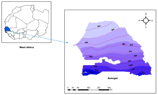 Senegal country (blue) in West Africa. Red lines are isohyets and numbers are their corresponding values in mm.