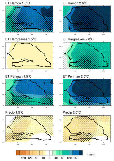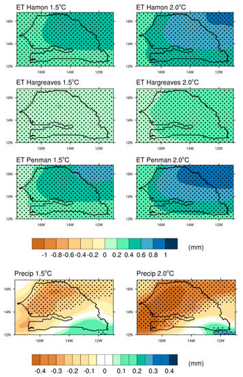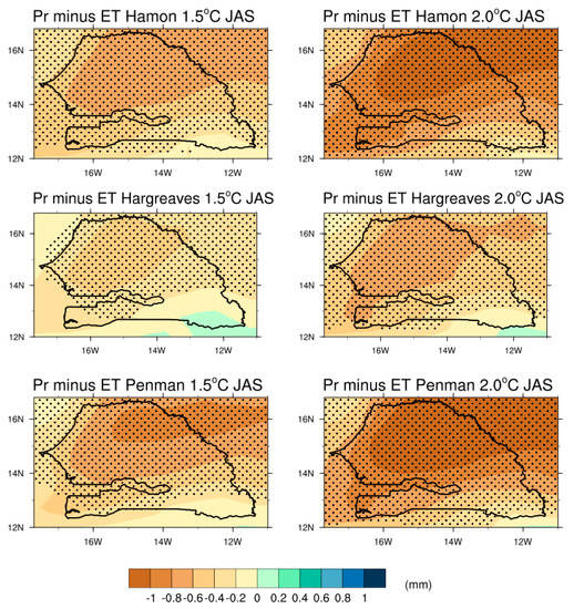 However, Hargreaves evapotranspiration estimates under 1.5 °C warming to show no significant changes of water shortage in the majority of the country; except the southeast, which shows possible wet conditions. The changes with Hargreaves under the 1.5 °C scenario are not important (around zero), and those under the 2.0 °C scenario are very low compared to the other estimates. The localities with high evapotranspiration and less precipitation will become drier (e.g., northern Senegal). Moreover, in this semi-arid region where dry and hot weather conditions prevail during the long dry season, the wind speed intensifies the evaporation process. This annual water decline is seen also in the seasonal change (JAS) of the water balance in Figure 5. These conditions are also generally found in the other seasons (Figures S4–S6).