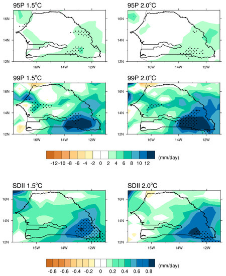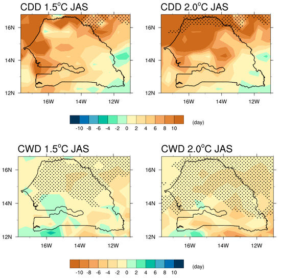 In this section, we present the potential changes of extreme precipitation over Senegal during the rainy season (JAS). An increase in the maximum number of consecutive dry days (up to 16 days) in the whole country is projected under both GWLs (Figure 6). The northern part of the country is significantly likely to experience the driest conditions in the future under 2.0 °C global warming.