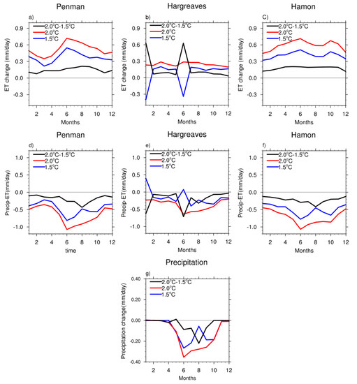 Seasonal cycle of Evapotranspiration (a,d: Penman, Hargreaves, and Hamon), water balance (P-ET) (b,e,g: with Penman, Hargreaves, and Hamon) and Precipitation changes (c,f) under 1.5 °C and 2.0 °C GWLs.