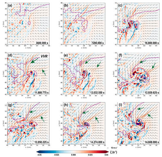 Select stages of the simulated supercell life cycle. (a) 3600.000 s, (b) 7200.000 s, (c) 10,800.000 s, (d) 11,888.775 s, (e) 12,032.550 s, (f) 12,929.625 s, (g) 13,950.225 s, (h) 14,274.000 s, and (i) 14,608.000 s. Vertical vorticity (light shading; s−1), horizontal wind (vectors; m s−1), and the 0.3 g kg−1 rainwater mixing ratio contour. Vertical vorticity rivers (VVR, in (d)) are denoted by green arrows in (d)–(i). Pockets of strong vertical vorticity associated with the tornadoes in the center of the domain are shaded in the foreground, starting at 0.1 s−1. All fields at 158 m AGL.