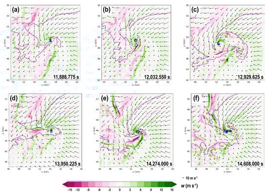 Vertical velocity field (light shading; m s−1) throughout the life cycle of the simulated tornadoes at (a) 11,888.775 s, (b) 12,032.550 s, (c) 12,929.625 s, (d) 13,950.225 s, (e) 14,274.000 s, and (f) 14,608.000 s (compare with Figure 2d–i and Figure 3a–i). Horizontal wind (vectors; m s−1) and the 0.3 g kg−1 rainwater mixing ratio contour are also plotted. Pockets of strong vertical vorticity associated with the tornadoes in the center of the domain are shaded in the foreground, starting at 0.1 s−1. All fields at 158 m AGL.