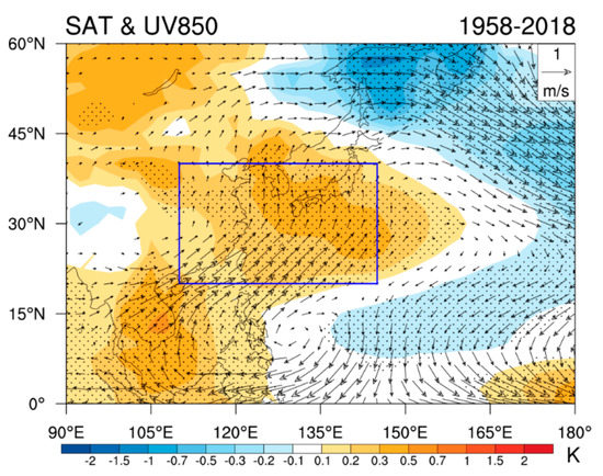 The wintertime (December to February) surface air temperature (SAT) (shading) and 850 hPa wind anomalies regressed onto the simultaneous normalized Niño-3 index during 1958–2018. Dots indicate the 90% confidence level based on a two-tailed Student’s t-test. Vectors exceeding 0.1 m/s are shown. The blue box indicates the region to define the East Asian surface air temperature (EAT) index.