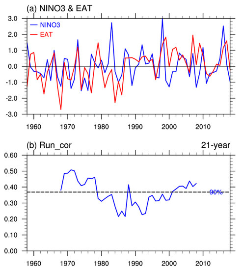 Figure 2a shows the normalized time series of the winter Niño-3 index and the EAT index from 1958 to 2018. The correlation coefficient between the winter Niño-3 index and the simultaneous EAT index reached 0.36 during the period of 1958–2018, exceeding a 95% confidence level. This result confirms that the winter ENSO has a significant positive relation with the EAT. However, a careful examination indicates that the in-phase ENSO–EAT relationship was not stationary during the past decades (Figure 2a). This is confirmed by the 21 year sliding correlations between the winter Niño-3 index and the EAT index (Figure 2b). The years displayed in the x-axis of Figure 2b correspond to the central year of the 21 year sliding window. The correlation coefficient between the winter Niño-3 index and EAT index was significant before the mid-1970s. It decreased afterward and became insignificant from the mid-1970s to the late 1990s. After that, it increased slowly and reestablished a significant ENSO–EAT relationship after the late 1990s. This oscillation of the ENSO–EAT relationship is basically consistent with the previous findings about the ENSO–EAWM relationship [23,24,25,26,27]. This result confirms that the influence of ENSO on the East Asian winter climate indeed experiences evident decadal changes.