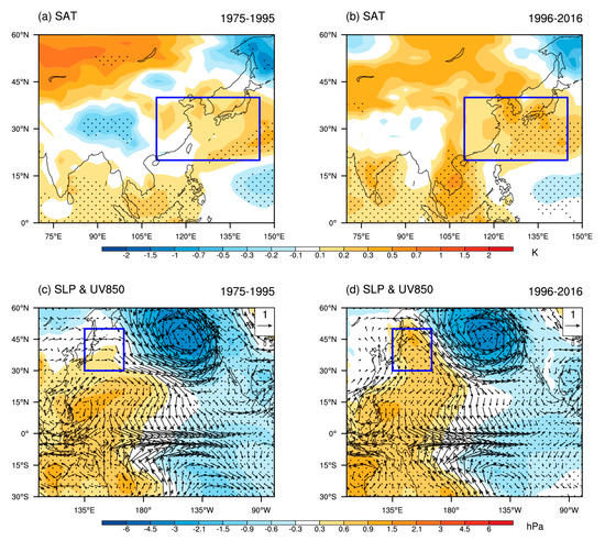 (a) The wintertime SAT regressed on the simultaneous normalized Niño-3 index during 1975–1995. (c) As in (a), but for sea level pressure (SLP) (shading) and 850 hPa winds (vectors). (b,d) As in (a,c), but for 1996–2016, respectively. Dots indicate the 90% confidence level based on a two-tailed Student’s t-test. Vectors exceeding 0.1 m/s are shown. The blue boxes in (a,b) indicate the region to define the EAT index. The blue boxes in (c,d) indicate the region to define the KACI index.