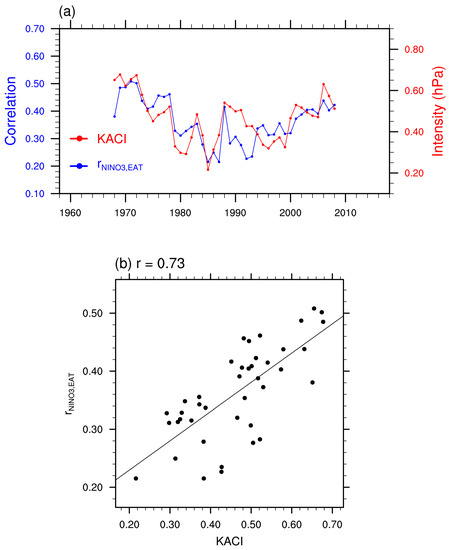 (a) Sliding correlation coefficient between the wintertime Niño-3 and EAT indices, i.e., rNINO3,EAT, with a 21 year window (blue line, using left y-axis), and the sliding Kuroshio anticyclone index (KACI, 30°–50° N, 135°–165°E) in a 21 year sliding window (red line, using right y-axis). (b) Scatter plot of sliding KACI (x-axis) versus sliding rNINO3,EAT (y-axis).