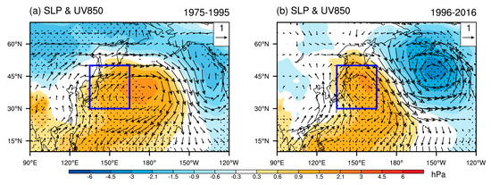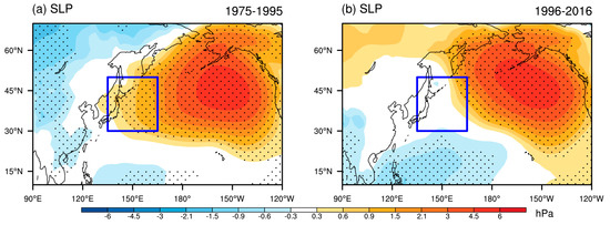 (a) The wintertime SLP regressed on the normalized the Aleutian Low index (ALI) over North Pacific region during 1975–1995. (b) As in (a), but for 1996–2016. Dots indicate the 90% confidence level based on a two-tailed Student’s t-test. The blue boxes in (a,b) indicate the region to define the KACI index.