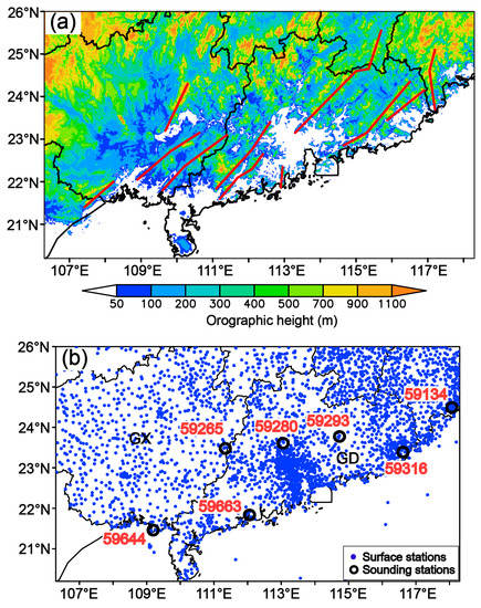 Distributions of (a) orography (color-shaded; units: m) and (b) observational stations over South China covering Guangdong (GD) and Guangxi (GX) provinces. The dots and circles in (b) indicate surface and radiosonde (marked with station IDs 59644, 59663, 59265, 59280, 59293, 59316, and 59134) stations, respectively. The red lines in (a) indicate the mountain lines illustrated in Figure 8.