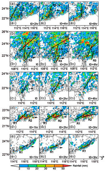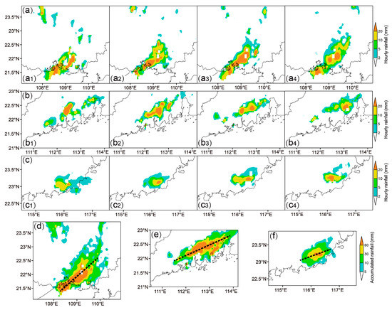 (a–c) Hourly rainfall distribution (units: mm) evolution and (d–f) cumulative rainfalls (units: mm) for the coastal organized warm-sector rainfall (OWSR) events occurring in the coastal areas of (a,d) Guangxi Province, (b,e) west Guangdong Province, and (c,f) east Guangdong Province, respectively. The dashed lines in (d–f) indicate the axes of the cumulative rainfall distributions. The times for panels a1–a4, b1–b4, and c1–c4 indicate 2100 UTC 24–0000 UTC 25 June 2014, 0800–1100 UTC 23 April 2012, and 0900–1200 UTC 9 April 2012, respectively.