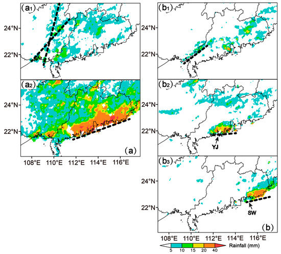 Composite distributions of OWSR (color-shaded; units: mm) over South China with (a, a1–a2) a long and (b, b1–b3) a short extension. (a1) and (a2) indicate the OWSRs located near the coastal areas of Guangxi Province and Guangdong Province, respectively, and (b1,b2,b3) indicate the OWSRs located at the boundary area between Guangxi and Guangdong provinces, west Guangdong Province and east Guangdong Province, respectively. The composite distributions for (a1), (a2), (b1), (b2), and (b3) are drawn from 31, 20, 6, 18, and 17 events, respectively. The dashed lines outline the primary orientations of OWSRs, and “YJ” and “SW” indicate Yangjiang city and Shanwei city.