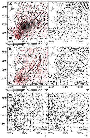 Inspection of all 92 OWSRs identified in this study, irrespective of rainfall extension or geographic location within South China, reveals they primarily occur in one of two basic synoptic situations. This will be illustrated using maps of 850 hPa and 950 hPa heights and winds, and sea-level pressures, shown in Figure 4. One type of synoptic situation [26,75,76], accounting for 73 events, is characterized by a trough over southwestern China (southwestern trough) and a strong southwesterly LLJ with its axis across GX and GD provinces (Figure 4(a1)) (referenced as synoptic situation SWLLJ), and a prominent surface low leading to strong southwesterly or southerly winds blowing near the surface in South China (Figure 4(c1)). The other type, representing 12 OWSR events, is characterized by an prominent anticyclone or high over the Yangtze River Basin (the region covering 105°–123° E, 25°–33° N, approximately), without a southwestern trough or winds larger than 8 m s−1 being present at 850 hPa over South China (Figure 4(a2)) (referenced as synoptic situation anticyclone regime—ACR). The associated surface high brings easterly winds to the coastal region of South China (Figure 4(c2)). (The remaining seven OWSR events, which are affected by an LLJ on the northwest side of a subtropical high over southeastern China (accounting for 3 OWSR events) or an LLJ at the bottom of a trough over eastern China (accounting for four OWSR events), are not discussed in this paper.)