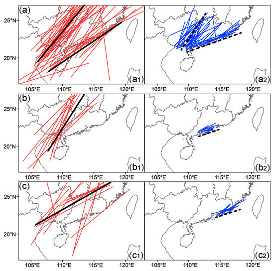 In contrast, the OWSRs with a short extension occur generally near the coastal area of BGG (the GX-GD boundary area), Yangjiang (YJ) city (such as the OWSR event shown in Figure 2(b1–b4)), or Shanwei (SW) city (such as the OWSR event shown in Figure 2(c1–c4)) when the LLJ axis is farther away, or when ACR occurs. The coastal OWSRs tend to align northeastward in GX Province (such as the OWSR event shown in Figure 2(a1–a4)) and more eastward in GD Province (such as the OWSR events shown in Figure 2(b1–b4,c1–c4)), likely owing to the orientation difference of the LLJs in these two provinces.