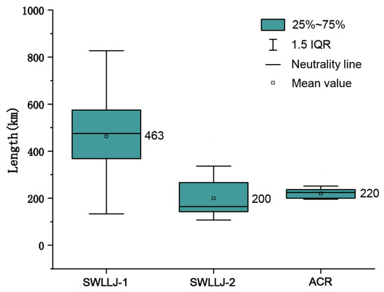 Box charts of along-axis lengths of the OWSRs over South China in the SWLLJ (SWLLJ-1 and SWLLJ-2) and ACR situations. SWLLJ-1 indicates the OWSRs located in the coastal areas of Guangxi Province and Guangdong Province in the SWLLJ situation, and SWLLJ-2 indicates the OWSRs located at west Guangdong Province and east Guangdong Province in the SWLLJ situation. The numbers indicate the mean along-axis lengths (units: km) for the OWSRs of SWLLJ-1, SWLLJ-2, and ACR.
