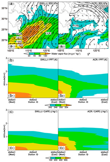 (a, a1 and a2) Composite water vapor fluxes at 850 hPa (color-shaded; units: m g s−1 kg−1), and vertical sections of composite (b, b1 and b2) virtual potential temperatures (PPTs; color-shaded; units: K) and (c, c1 and c2) convective available potential energies (CAPEs; color-shaded; units: J kg−1) for the OWSRs in the (a1, b1 and c1) SWLLJ and (a2, b2 and c2) ACR situations. The composite water vapor fluxes are overlaid with composite geopotential heights (contours; units: gpm) and wind vectors (units: m s−1) at 850 hPa. “station1” indicates the radiosonde station nearby the rainfall location, and “station2” and “station3” indicate the radiosonde stations to the east of “station1” along the orientation of rainfall extension.