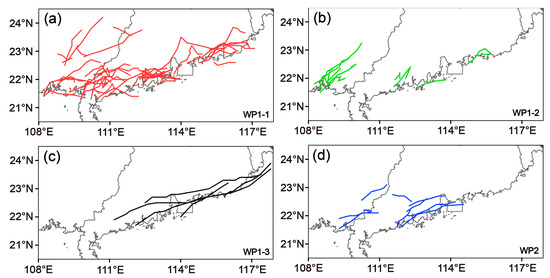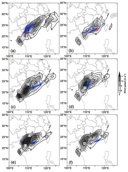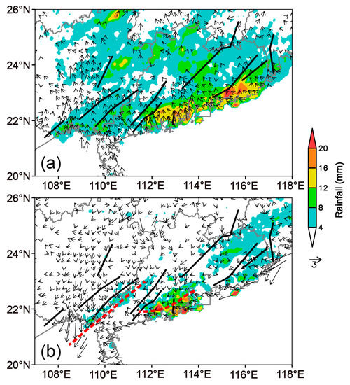 Furthermore, the long extension of the rainfall bands initiating in the coastal areas of GD (Figure 12a) and GX (Figure 12b) provinces are probably enhanced by the motions of the LLJ that are indicated in Figure 9a,b, respectively. That said, the rainfall bands initiating in these two coastal areas show different propagation characteristics. Aside from the eastward motion, a marked eastward merger is shown for the rainfall bands initiating in the coastal area of GD Province (Figure 12a), as the southwesterly LLJ moves eastward along the coastline (Figure 9b), whereas no distinct combination occurs for those initiating in the coastal area of GX Province (Figure 12b), as the LLJ’s northeastward motion is inland instead of along the coastline (Figure 9a). A marked eastward motion is shown for the rainfall bands under the WP1-3 and WP2 vertical wind profiles as well (Figure 14). However, an eastward combination occurs along the coast of Guangdong Province for WP1-3′s rainfall bands because of an eastward motion vector induced for the rainfall systems (Figure 14a).