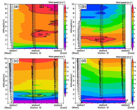 ((a–c); referred to as wind profiles 1-1, 1-2, and 1-3—WP1-1, WP1-2, and WP1-3) Three types of composite wind profile sections for the OWSRs in the SWLLJ situation and ((d); referred to as wind profile 2—WP2) the composite wind profile section for the OWSRs in the ACR situation. The color-shaded and vectors are wind speed and vectors (units: m s−1). “station1” indicates the radiosonde station nearby the rainfall location, and “station2” and “station3” indicate the radiosonde stations to the east of “station1” along the orientation of rainfall extension. “LLJ” indicates low-level jet which has been outlined with bold contours, and the dashed line in (d) indicates a vertical wind shear boundary.