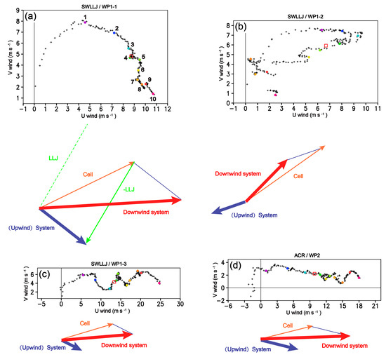 As mentioned in Section 2, Corfidi [73] proposed a vector-based technique to anticipate the motion of rainfall systems in the presence of cold pools and the potential for propagation away from the low-level flow, based on the earlier method of Corfidi et al. [74], which captured the effect of vertical wind shear. In present study, the impacts of cold pool and conditional instability that have been shown by Corfidi [73], which may lead to a better estimation for the rainfall system motion, are not further discussed, nor are the mechanisms involved. We utilized that technique solely to estimate the average motion of the OWSRs occurring under different vertical wind profiles, as illustrated in Figure 11, anticipating that the downwind system motion was most applicable. In all four cases (WP1-1, WP1-2, WP1-3, and WP2), the rainfall cells tend to move northeastward with the southwesterly LLJ or strong upper-level southwesterly winds, but the anticipated system motions are somewhat different. The WP1-1, WP1-3, and WP2 vertical wind profiles imply an eastward motion vector for the rainfall systems, owing to the combination of a southeastward upwind system motion vector and a northeastward cell motion vector (Figure 11a,c,d). In contrast, the rainfall systems tend to move northeastward under WP1-2′s vertical wind profile, which leads to the combination of a large northeastward cell motion vector and a relatively small southwestward upwind system motion vector (Figure 11b).