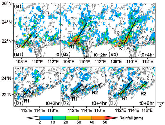 Evolution of composite cumulative rainfall distributions (color-shaded; units: mm) and near-surface wind vectors (units: m s−1) under the vertical wind profile of WP1-2 in the SWLLJ situation. The lines (“R1” and “R2”) and arrows indicate rainfall belts and their approximate motion directions, respectively. “t0” and “t0 + x h” indicate the initial time of rainfall and “x” hours after. “a, a1–a3” and “b, b1–b3” show the evolution of the rainfall distributions and near-surface wind vectors near the coastal areas of Guangxi and Guangdong Province.