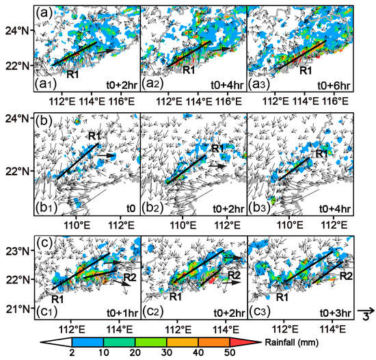 Evolution of composite cumulative rainfall distributions (color-shaded; units: mm) and near-surface wind vectors (units: m s−1) under (a, a1–a3) the vertical wind profile of WP1-3 in the SWLLJ situation and (b, b1–b3 and c, c1–c3) the vertical wind profile of WP2 in the ACR situation. The lines (“R1” and “R2”) and arrows indicate rainfall belts and their approximate motion directions, respectively. “t0” and “t0 + x h” indicate the initial time of rainfall and “x” hours after. “a1–a3” to “c1–c3” show the evolution of the rainfall distributions and near-surface wind vectors near the coastal areas of Guangdong Province, the boundary between Guangxi and Guangdong provinces, and west Guangdong Province.