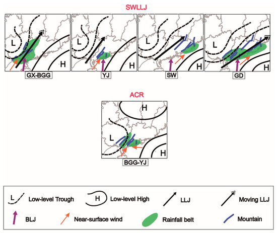 The OWSRs in the ACR situation are prone to move eastward in the vicinity of BGG or YJ city. In contrast, rainfall system motions in the SWLLJ situation can be further classified into two sub-types with regard to the intensity of the upper-level winds overlying the LLJ. The rainfall systems tend to move eastward in South China, when the upper-level winds are as strong as or much stronger than the LLJ (such as the OWSR event shown in Figure 2(b1–b4)), while they tend to move northeastward near the coastal area of GX Province (such as the OWSR event shown in Figure 2(a1–a4)), YJ city, or SW city when the upper-level winds are much weaker than the LLJ. In addition, an obvious eastward aggregation is prone to occur for the rainfall bands of the OWSRs when the LLJ moves along the coastline or stays near the coastline with much stronger upper-level winds coupling with it.