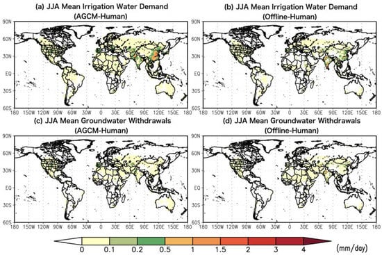 Spatial distribution of the irrigation water demand and groundwater withdrawals from AGCM–Human (a and c) and Offline–Human (b and d) simulations, respectively. Results are shown in mm/day and are averaged over the boreal summer (June–August: JJA) during the years 1998 to 2010.