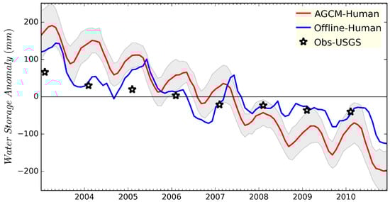 Comparison of simulated monthly terrestrial water storage anomalies (mm) averaged over the region overlying the High Plains aquifer with the observations from the United States Geological Survey (USGS). Blue and red lines represent the Offline–Human and AGCM–Human simulations, respectively. The USGS observations (stars), which are reported once every year in spring, are plotted in the month of February. The gray shading denotes ±1 standard deviation from the mean for ten ensemble simulations.
