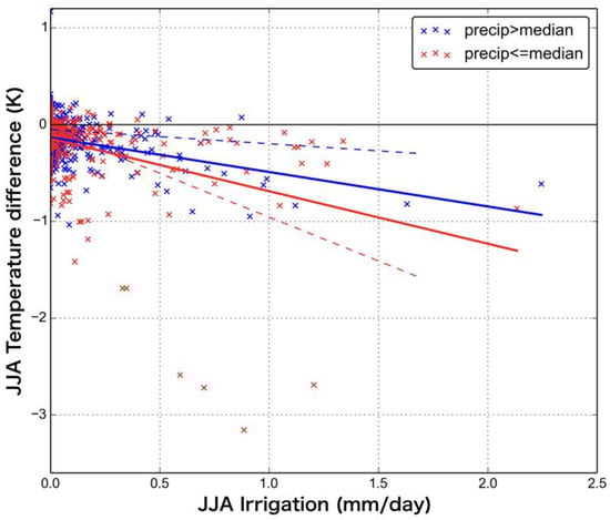 Differences in JJA near surface air temperature between AGCM-Human and AGCM-ORG simulations as a function of JJA irrigation amount. The relationship is separated into points with precipitation greater than the median (blue crosses) and with precipitation less than the median (red crosses) following Sacks et al. []. Blue and red solid lines denote regression lines for large (blue crosses) and small (red crosses) precipitation grid cells, respectively; the dashed lines with the same colors show the results from Sacks et al. [].