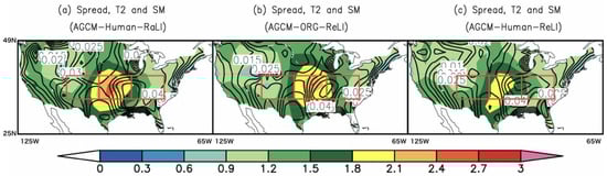 In this figure, warmer colors indicate a large spread of values among the ensemble members; similar results for soil moisture are shown as overlaid contour lines. These results suggest that both the inclusion of human activities, especially irrigation, and realistic land initializations significantly contributed to a decreased spread among the ensemble members for air temperature. The spread of soil moisture over the three hatched boxes (west, middle, and east, from left to right) was investigated for the three forecast simulations. The central hatched boxes in Figure 4, which includes the center of the Mississippi River Basin, indicate large differences in the spread of soil moisture among different experiments, with AGCM–Human–ReLI showing the smallest spread (~10%) compared to the other two experiments. This evidently suggests that the variation in soil moisture levels is strongly influenced by the land disturbance due to human activities in addition to realistic land initializations, resulting in a smaller spread of air temperatures over the Central US.