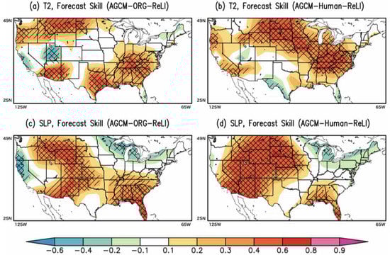 Finally, the forecast skills of near-surface variables, such as air temperature (K) and sea level pressure (hPa), are investigated using the AGCM–ORG and AGCM–Human simulations in association with realistic land initializations (ReLI). AGCM–ORG–RaLI is not considered here because the GLACE-2 project has already reported that land initializations can contribute to the subseasonal forecast skill in air temperature []. Figure 5a,b show the forecast skill of air temperature for (a) AGCM–ORG–ReLI and (b) AGCM–Human–ReLI. The forecast skill is estimated by calculating the year-to-year correlation coefficients between forecasts and observations. In this analysis, the Japan Meteorological Agency Climate Data Assimilation System (JCDAS) [] and National Centers for Environmental Prediction/National Center for Atmospheric Research (NCEP/NCAR-1) reanalysis data [] are treated as observations for near-surface temperature and sea level pressure, respectively. As shown in Figure 5a,b, AGCM–ORG–ReLI shows improved skills over the Eastern US, as well as the southwestern and northwestern regions. This demonstrates that the incorporation of human land disturbance due to irrigation in an AGCM can substantially improve the subseasonal forecast skill. In particular, the regions with improved forecast skills expand over the central region by connecting the southeastern and northwestern regions. A similar characteristic can be seen for the sea level pressure in Figure 5c,d. A higher forecast skill can be seen in the Southeastern, Southwestern, and Northwestern US (Figure 5c). In Figure 5d, for AGCM–Human–ReLI, a higher forecast skill is apparent in western to northern mid-regions, despite the slightly weaker forecast skill in the Southeastern US. In both forecast simulations, there were negative correlation coefficients for the Northeastern US, and no improvements in forecast skills due to the incorporation of irrigation are found.