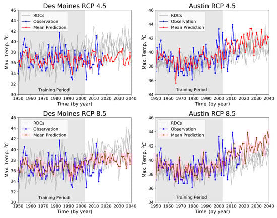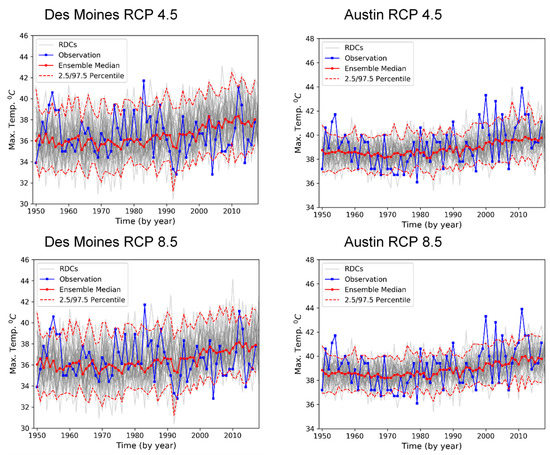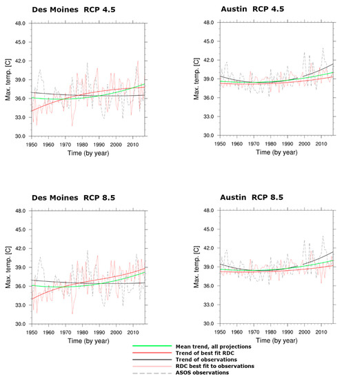 In general, the RDC annual maximum temperatures for Austin are cooler for most years than what has been observed, possibly suggesting an inability of GCMs to account sufficiently for the urban island heat effect and changes in urbanization due to their relatively coarse spatial resolution [13,14,15]. The GCMs that generated these RDC data do not invoke an urban canopy model, which is an option incorporated in certain regional models [41,42].