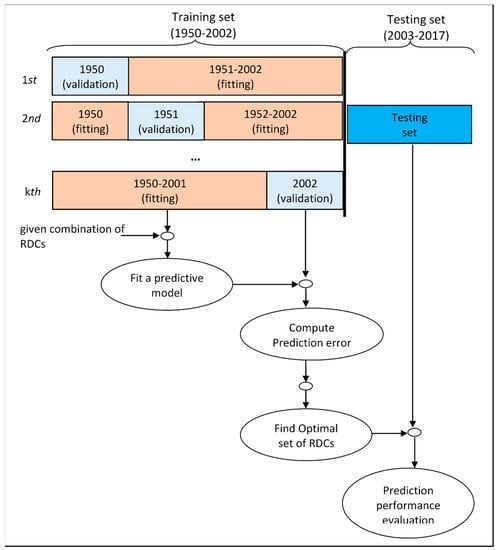 In order to determine the appropriate number of covariates and include only those that are most influential for the model solution, it was decided here to use a cross-validation technique—in particular, the leave-one-out cross-validation (LOOCV) technique. This technique uses the data points in the training period for suitably selecting covariates with respect to observations [35,39]. In our analysis, we use 1950–2002 as the model training period. Suppose we use data points (years) in the model training period, over which the LOOCV technique is applied. Here, data points are used for fitting the model, while the remaining one data point, treated as the validation data point, is used for evaluating the prediction error. We repeat this procedure times with all the different validation data points (Figure 2) and compute the MSE using all the validation data points as follows: