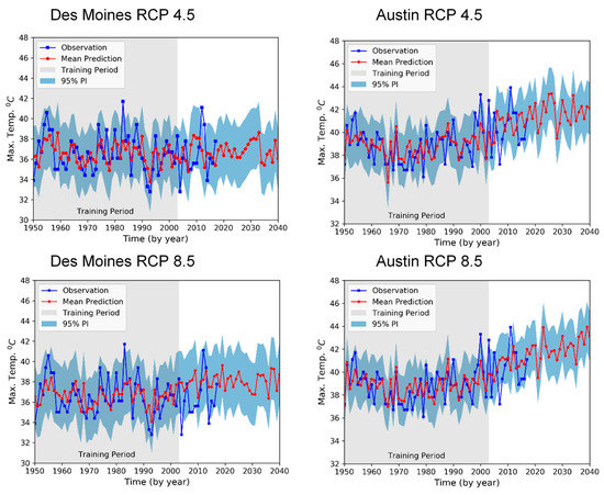 Annual mean peak temperature predictions (red lines) with envelope for 95% PI (aqua) and observed annual maximums (blue lines) from 1950 to 2017 for Des Moines and Austin. Predicted values are based on RDC projections of RCP 4.5 (top) and 8.5 (bottom) climate scenarios.