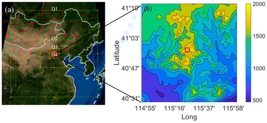 Simulated domain of the Weather Research and Forecasting (WRF) model: (a) Scope of the four nested domains (D1~D4) used in the wind simulation; (b) Topographic distribution of the innermost domain (D4). The red box represents the computational fluid dynamics (CFD) domain, latitude: 40°56′22″–40°58′32″, longitude: 115°23′53″–115°26’45″.