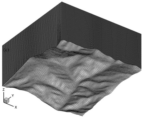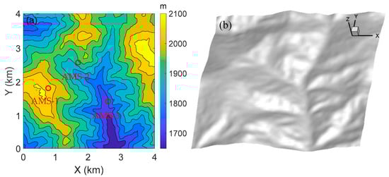 The abrupt terrain of the Chongli Mountain region could greatly affect the atmospheric flow, so a high-resolution terrain is essential for CFD. To achieve a high-quality 3D terrain model, the high-resolution terrain dataset Advanced Spaceborne Thermal Emission and Reflection Radiometer (ASTER) Global Digital Elevation Model (GDEM) [44] was utilized in the CFD domain. A diagram of the CFD configuration based on the ASTER GDEM is shown in Figure 2. Figure 2a shows the topographic distribution of the CFD domain with the three AMSs in the region: AMS-1 is situated on the mountaintop, AMS-2 is on the mountainside, and AMS-3 on the mountain foot. Figure 2b illustrates the 3D terrain model. Figure 2c shows the CFD domain, which is discretized with hexahedral grids [45]. The CFD domain is 4 km × 4 km in the horizontal direction and is 2 km high vertically. The mesh of the CFD domain was established by the GAMBIT software (version 2.4.6), comprising 1.01 × 106 hexahedral cells with a horizontal grid length of 40 m and a vertical grid length of 20 m. Moreover, the height of the first layer in the mesh is 0.1 m from the ground.