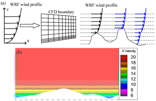 Generally, the coupling method that the WRF-CFD model uses is extrapolation [55]. In extrapolation, a single WRF profile is imposed on an entire inlet face of the CFD domain, and WRF wind data are extrapolated in the CFD grid points that are below or above the WRF profile. Figure 3a depicts a diagram of the extrapolation method over complex terrain. Figure 3b presents the wind velocity on a CFD boundary using extrapolation. From the figure, it can be seen that the distribution of wind velocity on the boundary is uniform in the horizontal direction, which may not correctly describe the effects of actual terrain in the upwind direction. Extrapolation may not be capable of appropriately coupling the WRF and CFD models over complex terrain.