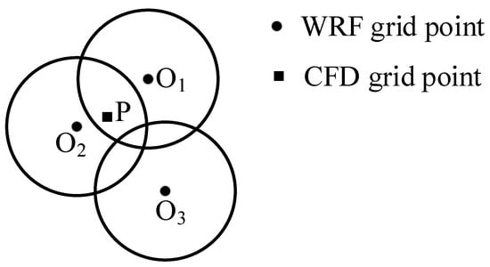 To solve the problem of huge terrain differences between the WRF and CFD models, we used Cressman interpolation [56,57,58] as the coupling method. Figure 4 shows a sketch map of the Cressman interpolation function, where P represents the CFD grid point and O1, O2, and O3 represent the WRF grid points. The black circles indicate the influence range of each WRF grid point. It can be seen that the wind speed at point P is determined by O1 and O2, but not influenced by O3.