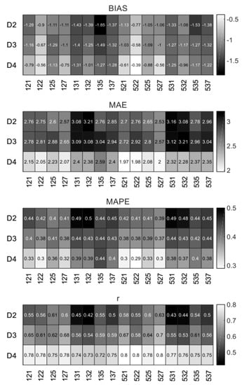 Figure 6 shows the calculated results of the sensitivity analysis for domains D2, D3, and D4 and the 16 simulations. Due to the low horizontal resolution, D1 was not taken into account. The darker gray colors reflect the poorer values (BIAS, MAE, MAPE, and r), while the light gray indicates the better values.