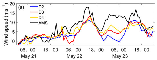 Two coupling methods were compared in this study: the WRF-CFD model with extrapolation is expressed as WRF-CFD-1, and that with the Cressman interpolation is expressed as WRF-CFD-2. The period of the WRF-CFD simulation was from 00:00 on 21 May 2018 to 00:00 on 24 May 2018 (Beijing Time), 72 h in total. The time interval of the model outputs was 1 h.
