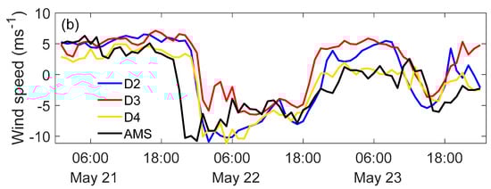 Time series of simulated wind speeds for domains D2, D3, and D4: (a) u component (m/s); (b) v component (m/s).