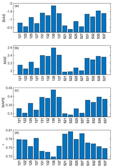 Histograms of BIAS, MAE, MAPE, and r calculated for domain D4 and 16 simulations: (a) BIAS; (b) MAE; (c) MAPE; (d) r.