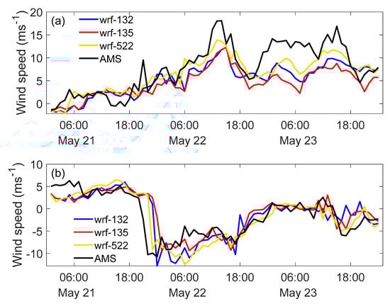 Because the horizontal resolution of 1 km (D4) was the best, the calculated results of the sensitivity analysis are shown in Figure 8 for the domain D4 only. In general, the simulations using the NG/NG radiation scheme were slightly better than those using the MM5/RRTM parameterization. Moreover, the simulations using the NLSM land surface scheme were better than those using the RUC scheme. Meanwhile, the simulations using the MYJ scheme had the best performance, and those using the MYNN scheme had the worst. Prasad et al. [59] explained that the deep mixed layer estimated by MYNN may result in underestimation of the wind speed, contrary to the shallower mixed layer simulated by YSU. Hence, the best performances were achieved with the NG/NG shortwave/longwave radiation scheme, NLSM land surface scheme, and MYJ–PBL scheme (WRF-522) in the Chongli Mountain region. Figure 9 shows the time series of the simulated wind speeds using different physical schemes. Here, the physical schemes used in the WRF simulation are WRF-132, WRF-135, and WRF-522. In addition, the AMS station referenced was AMS-1. From the figure, it can be seen that the wind speed (u and v components) of the WRF simulation initialized with WRF-522 was closer to the observed value than those with WRF-132 and WRF-135.