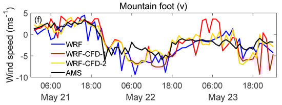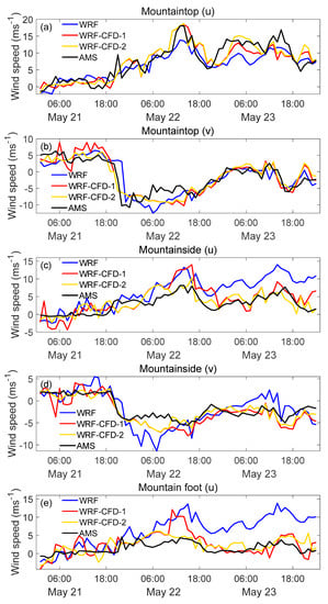 The wind fields from the WRF-CFD simulations were compared with those from the WRF simulations, as shown in Figure 13, Figure 14 and Figure 15.