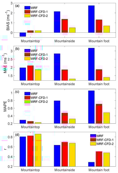 Firstly, WRF-CFD has a better performance than WRF in predicting microscale wind field. For instance, MAE on the mountainside decreased from ~2.84 ms−1 for the WRF simulation to ~1.86 ms−1 for the WRF-CFD-1 simulation, and ~1.28 ms−1 for the WRF-CFD-2 simulation. Likewise, BIAS, MAPE, and r also indicated great improvement from the WRF to the WRF-CFD simulations.