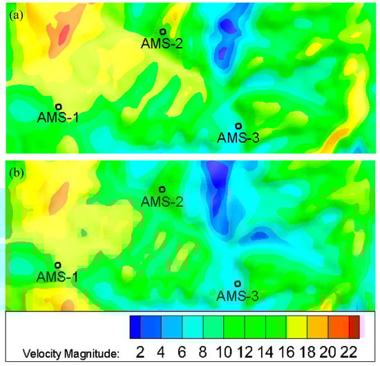 Local distributions of near-surface (10 m AGL) wind speed (m/s) obtained from the (a) WRF-CFD-1 simulation and (b) WRF-CFD-2 simulation, 16:00 on 22 May 2018.